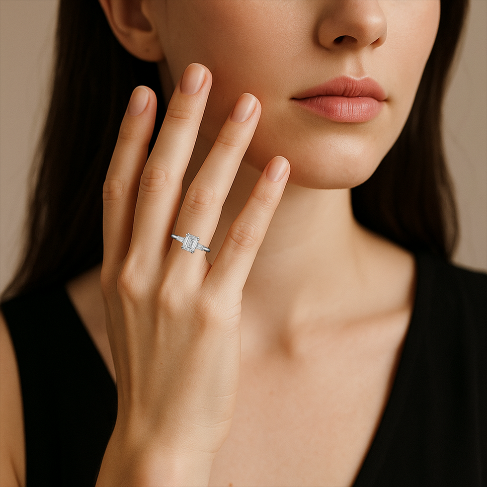 Because this design offers multiple center-stone sizes (3 - 5 ct) and US ring sizes 4–9, the exact measurements will adjust proportionally to maintain balanced proportions and a seamless design. Larger stones will be paired with proportionally longer tapered baguettes, and the basket height will adjust slightly to support the center stone securely. Every ring is crafted to ensure the three-stone layout remains harmonious, regardless of the size chosen.